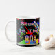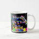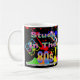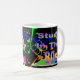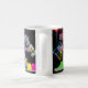 Klassiskt vitt 11 oz. mugg med en bild på båda sidor av rött, orange, gult, grönt och blåfärgade stänk, högtoppssensorer i neon färg, kassettband, färgstarka solglasögon och texten "Stuck i 80-talet" i neon brev.