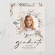 Inbjudan till Studentfest för student Blommigt. Chic och modern, den här inbjudan till snyggt studentfest innehåller vacker, handmålad tropisk kräm och elfenbensblommor, brunt pampasgräs med sage grönt handflatan löv arrangerad som trendig ram för ditt studenten-foto. Bakgrunden är beige och texten är svart. Baksidan av inbjudan innehåller en text för anpassning. Hitta matchande objekt i samlingen Tropical Boho Bröllop.