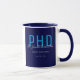 En doktorsexamen i studenten mugg som har student:s namn, studiens fält och studenten. Mugg inkluderar namn i ett handskriftsteckensnitt. Utformningen har ett blått och vitt färg-schema. Det är underbart som en keepsaké eller partiförmån. Lägg bara till student information, lägg till mugg i din kundvagn och grattisar på denna viktiga milstolpe! Student Blue Namn grad PhD Mugg Holiday Design | ©Melissa Patton - Designer