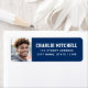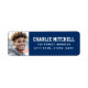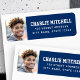returetiketter i studenten som innehåller ditt foto med student namn i ett stil-skollegium till högerna med adress nedan på en mörk blått bakgrund.