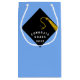 Studenten presentsäck med kreativ svart och guld sockel och grattisar på ljusblå bakgrund. Om du vill anpassa redigerar du text för att lägga till namn i din favoritklass.