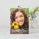 Tack till din familj och dina vänner med det här fotot som anpassningsbarna studenten tackar dig för. Den här moderna designmallen för blommigt innehåller ditt foto på framsidan med orden "Tack" gått med av ett hjärta i ett vitt handskript. Nedan följer ett namn och år som du kan anpassa dig till. Kortets baksida har ett tackmeddelande med din namnteckning accentuerad av en solrosliknande blommar.