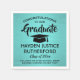 Lägg till en elegant personlig till dekorationer för studentfest på högskolenivå eller gymnasieutbildning för henne med de här anpassningsbarna, pappra blöjor. All text är enkel att anpassa. Utformningen har en turkosbild av borstad bakgrund av rostfritt stål, svart pantskavla, modern typografi av snyggt och trendig handskriven kalligrafi av stil-skript. Observera att bakgrunden är tryckt på färg, inte metallfolie. Grattisar till student!