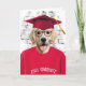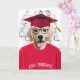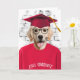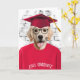 Hund i röd t-shirt och röd studenten-hatt för grattisar i student.