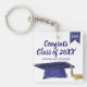 En nyckelkedja i studenten med en blå studentmössa- och skripttypografi med texten "Gratulerar Grad". Lägg till en extra-rad med anpassningsbar och årsklass för att anpassa. Gör en speciell studenten-gåva till en enskild grad eller hela klassen.