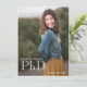 Ett foto PhD studenten-meddelande som innehåller ditt namn, klassår, ett tackbrev och mycket annat. På annonsens framsida visas ett foto av lodrät. Den andra sidan har en röd bakgrund. Byt ut fotot, anpassa ord, lägg till meddelandet i din kundvagn och låt alla veta att du har åstadkommit något stort. <i>Fotografi © Storytree Studios, Stanford, CA</i>