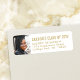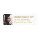 Lägg till en personlig för snyggt till college eller high school tillkännagivande för studenten och inbjudningar med anpassningsbar fotovita och guld-returetiketter. Alla formuleringar i den här mallen är enkla att anpassa. Utformningen av dessa klistermärken har en valfri bild och en enkel, modern, minimalistisk typografi, år, namn och returadress. Observera att guld är tryckt på färg, inte metallfolie. Gör en elegant till inbjudan och tackkort. Gratulerar till Grad!