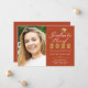 Meddela studenten i stil med det här fotoannonskortet för anpassningsbarna i elegant. Den här designen har ett foto till lämnat och till högerna med en typografisk design med ord Student-klass 2024 med ditt namn, din skola och ditt datum för att anpassa dig i guld och ett vitt skript som accentueras av ett faux guld student-lock på en orange bakgrund. Kortets baksida är orange. Designad av Susan Coffey.