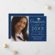 Meddela din akademiska examen till din familj och dina vänner med det här platta kortet för chic. Elegantens designmall innehåller ditt foto på den lämnat 3,5x5 och på högerna på en royalets blå bakgrund står det "Student CLASS OF 20XX" med ditt namn, din examen, din skola och ditt datum nedan i en modern faux silver-skripttypografi som accentueras av en silver-studentmössa. Designad av konstnären ©Susan Coffey.