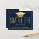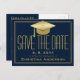 På så sätt kan man spara postkort för högskoleexamen eller högskoleexamen, med modern typografi i faux guld på marinblått med en guld-studentmössa. Designmallen har en guld gräns som tillför lite elegans. På framsidan står det: "Spara datum, (datum i studenten), för att vara närvarande studenten i (ditt namn)."På baksidan av kortet finns alla uppgifter om studenten i faux guld med party inbjudan på blå bakgrund. Designad av konstnärer ©Susan Coffey och Tim Coffey.