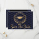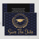 Jag tycker om att designa konstverk för studenten. Detta är underbart och unikt konst deco stil med elegant klassisk guld, svart och blå färg. Spara datum meddelande-kort. Modern stil. Lägg till ditt eget meddelande på kortets baksida med ge uppgifter till din familj och dina vänner för att spara datumet för en ceremoni, ett evenemang, ett evenemang, party eller ett annat tillfälle. Logotyp stil har löv, stjärnor och en studentmössa. Grattisar till student.