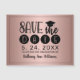 Meddela din studenten till din familj och dina vänner med eleganten spara datum magneter. Den här designmallen har en modern typografisk design i svart på ro guld som accentueras av en studentmössa. På vykortets framsida står "Spara datum för att närvara studenten" med datum och namn för att du ska kunna anpassa dig. Gratulerar på studenten! Designad av konstnären ©Susan Coffey.