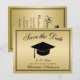 Meddela ditt kommande studenten i stil och få dina släktingar och vänner att spara datumet med det här eleganten-platta kortet. Utformningen har en faux guld-bakgrund med orden "Save the Date" i svart skript. En vanlig svart studentmössa finns i mitten och nedanför är det datum och det namn du ska anpassa. På baksidan av kortet finns mer information som du också kan anpassa. Designad av konstnären ©Susan Coffey.