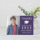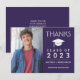 Tack vare det här fotot studenten-kortet i anpassningsbarna finns ett foto till lämnad och till högerna en typografisk design av vit text på lila som accentueras av en studentmössa. Lägg till ett tackmeddelande på baksidan av kortet och namnteckning eller ta bort det. Designad av konstnären Susan Coffey.