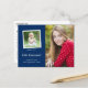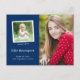 Det här meddelandet från studenten innehåller en klassisk design, två foton och en marin blå bakgrund. Postkortets framsida innehåller ett stort foto på högerna och ett mindre fyrkantigt foto på den lämnat. Under fyrkantiga bilder lägger du till student namn, klassår och skola. På baksidan av vykortet kan du lägga till ett längre personligt meddelande och information om studentfesten.