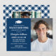 I "BQ-festinbjudan" finns ett foto av student med studentmössa motif, snyggt anpassningsbar text i rustiskt och modernt typsnitt, en rulla, plaid mönster design inslag och vit text. Den mörk marinblå bakgrunden och gingham tabellecloth som la mönster på baksidan av kortet kan anpassas. Perfekt för en avslappnad utomhus sommartid studentfest.
