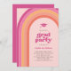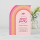 En färgstark inbjudan till studentfest för rosa och orange. Den färgstarka regnbågsgrafiken inspireras av 70-talets retrodesign. Den här funkyn är perfekt för en studentfest för ett högskoleprogram i student! Ord ’grad party’ är i ett retrotypsnitt för att slutföra utseendet.