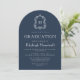 Den här klassiska inbjudan till studentfest med elegant har en vit monogramssymbol i ett öppet serif-teckensnitt som omges av en acanthus-vapensköld på en bågformad marktblå bakgrund. Anpassa texten till uppgifterna om student namn och party. Kortets baksida är fast marin blå. Perfekt för en högskola, högskola eller universiteten student.