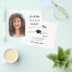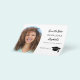 Observera att det här Spara datumet är pappert och mycket tunt. Kuvert ingår inte. Om du vill ha tjockare Spara datumkort (samma design) kan du besöka vår butik. Ett foto Spara datumet för en studentfest. På framsidan: Lägg till ett eget lodrät storlekt foto av student. Photo Arch ram. En vit chic, svart text. Mallar för namn och datum. Namn och texten: Spara datumet är skrivna med ett modernt handskript i stil. Tassel topper med lock. Tillbaka: Information om party.