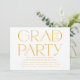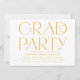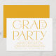 Modern grad party-inbjudningskort med "Grad Party" som visas i trendigets gult med studenten på vit bakgrund. Anpassa inbjudningskorten för studentfest av gult med uppgifterna om student namn och party som visas nedan. De djärva inbjudningarna till studentfest av typografi är perfekt för studenter i högskolan och högskolan.