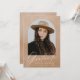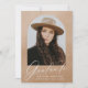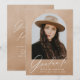 Inbjudningar till studentfesten elegant som innehåller student-fotot inuti en båge ram med sandbakgrund. "Student" visas i ett vitt, modernt kalligrafiskript med student namn, skolan och graderingsåret som visas nedan. Baksidan av fotoinbjudan innehåller information om din studentfest med en vattenfärgsbakgrund med sandig beige studentfest.