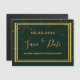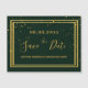 A Spara datummagnetiskt kort för en Studentfest party. En grönt med bakgrund som dekorerats med guldkonetti och faux guld ram. Anpassa och lägg till ett datum och namn. Golden färgad brev. Texten: Spara datumet skrivs med ett stort trendig-handskript i stil.