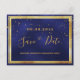 Spara datumkortet för en Studentfest party för en kille, man, man. En mörk blått bakgrund som är dekorerad med guldkonetti och faux guld och svart ram. Den blå färg är ojämn. Mallar för ett datum och namn. Golden färgad brev. Texten: Spara datumet skrivs med ett stort trendig-handskript i stil. Bakåt: utformning av vanligt vykort.