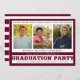 Modern inbjudan till studentfest med tre foton. Innehåller en redigerbar titel som du kan lägga till deras skola och/eller KLASS AV år. Partsinbjudningsinformation finns på framsidan och det finns en ställe på baksidan om du vill lägga till information om student eller ytterligare party-information, t.ex. ett OSA datum och kontaktinformation eller anvisningar (ta bort exempeltexten om du inte vill). Systemet Burgundy/Maroon, silver och White färg. PHOTO TIP: För snabbaste/bästa resultat väljer du ett foto med subjekt i mitten och/eller före skörd till en liknande form som den som visas före uppladdningen och fyller fotot perfekt. Kontakta designern om du vill att designen ska ändras eller på en annan produkt.