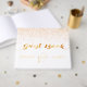En gäst bok för en glamorös, elegant och modern studentfest. En chic vit bakgrund med gyllene konetti sprinkle. Texten: Guest Bok är skriven med trendiget faux guld brev. Texten: Student, år (vilket år som helst) och namn är skriven med guldbrev. Dekorerad med en modern topplapp för abstrakten. Mall för texten på ryggraden.