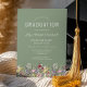 En vacker vattenfärgsblommigt gräns av vilda blommor dekorerar grund kant i det här trendiget boho studentfest inbjudan. Anpassa den vita grönten på sidans bakgrund med student namn i handskriftsskript, skolåret och klassåret i sans serif samt datum-, plats- och OSA-information i serif-teckensnitt. Kortets baksida är en solid sage grönt.