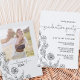 Detta roliga inbjudningskort för eleganta studentfester är perfekt för en minimalistisk grad party. Blommigtens design har en enkel och elegant arrangemang av delikata svarta och vita vilda blommor parade med ett romantiskt kalligrafteckensnitt. Anpassa baksidan med ett foto och studenten.