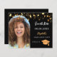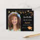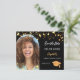 Ett foto Spara datumkortet för en studentfest 20XX. På framsidan: Lägg till ett eget lodrät storlekt foto av student. En båge formad ram. En chic svart bakgrund färg, dekorerad med faux guld-stjärnor. Anpassa och lägg till namn och datum. Namn och texten: Spara datumet är skrivna med ett modernt handskript i stil. Tillbaka: Information om party. 1 lakan = 1 inbjudan tryckt kant till kant.