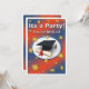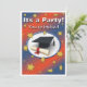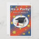 Inbjudan till en studentfest, med bild av tak och diplom på texturerad bakgrund, av blått och rött/orange med stjärnsprängningar av gult.