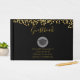 En gästbok som säger Klass 20xx och student namn och skola, skriven i guld färg. Designad med en svart studentmössa omgiven av en halvgenomskinlig vit cirkel. Den övre delen av kant är diekorerad med falska guld glitter-konfektyrer. Den svarta bakgrunden med guld-bokstäver är enkel än snyggt.