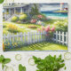 En drömlik kustnära cottagestil-landskap fylld med mjuk akvarell charm och luftig havstranquilitet. Ett välkomnande kustnära hus ligger bland frodiga trädgårdsgångar, blommande blommor och ett ljust vitt staket, som skapar en varm saga-atmosfär. I fjärran reser sig en hög fyr vid sidan av gnistrande blå havsvågor, vilket ger en klassisk nautisk touch till denna fredliga kustmiljö. Fluffiga moln driver över en livfull himmel medan solljus sköljer över pastellfärgade blommor, gröna gräsmattor och glada rabatter. Den mjuka penselföringen ger scenen en fantasifull, målerisk känsla som påminner om mysig kustnära livsstil, hus-trädgårdar och avspända eftermiddagar vid havet. Fär