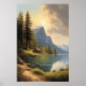 stuga mot en sjö nära bergen poster