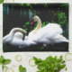 Konstfotografi som presenterar vit för elegant två, svart och stumma svanar för orange i en sjö, redigeras för att ge den som ett painterly verkställer. Skvalpar grön lövverk för rik och uppsättningen bakgrunden, som himmlen och träden skapar reflexioner på det mörka vatten.