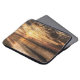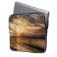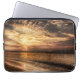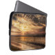 Ett lysande landskapsfoto av soluppgång över en strand med ett dramatiskt grumligt himlar i motsats till lugnen vatten.