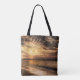 Ett lysande landskapsfoto av soluppgång över en strand med ett dramatiskt grumligt himlar i motsats till lugnen vatten.