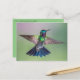 Vykort med en lila-styrd hummingbird i bergskräm under flygning, med dess bedövande iridescent lila, grönt och blå fjädrar på visningen - unikt och vackert kort för hummingbird och nature älskare. Foto taget vid Bosque de Paz Reserva Biologica, Valle del Rio Toro, Alajuela, Costa Rica.