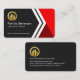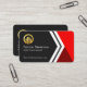 Cover features an arrows design that is accentuated by red trapezium layers. On the right is a dark grey area where a gold global logo you can use is at the top. Just below lies your prestigious name and job title with the business name at the base of the card.