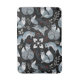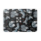 Seamless pattern of stylized blue foxes with intricate floral designs on black. Red accents and white flowers create a whimsical, mystical vibe.