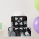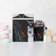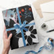 Seamless pattern of stylized blue foxes with intricate floral designs on black. Red accents and white flowers create a whimsical, mystical vibe.