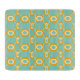 Stylized geometric pattern with bold orange hexagons and white details against a teal background, forming a repeating, symmetrical design.