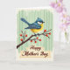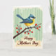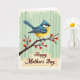 This card features a stylized songbird perched on a thin dark-brown branch dotted with round red berries, as if pausing to share a quiet moment ❤️. The bird’s feathers mix bright blue, sunny yellow, and crisp white, and its small dark eye has a gentle, curious look that feels like a soft hello. A slightly ruffled crest and neatly layered wings add a sense of lively closeness, like it’s leaning in to be noticed. The bird sits a bit above center, leaving open space below for the message and giving the scene an airy balance. Behind it, vertical stripes in soft sage green and muted cream create a calm, garden-like backdrop with a cozy, affectionate mood 🌼. Near the bottom, the words “Happy Mother’s Day” appear on a lightly curved cream banner, with dark brown lettering that stands out clearly. The banner stretches across the lower portion of the card, centered beneath the branch and berries, with the striped background continuing behind it. The overall look is finished with the blue-and-yellow bird above, the red berries clustered along the branch, and the cream banner anchored against the sage-and-cream stripes.