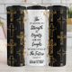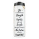 Det här ger en skarpare bild av citatet "Hon är KLÄDD I styrka och värdighet OCH hon är döende utan rädsla för framtiden". Texten, som citerar "Proverbs 31:25", finns i skript för elegant och fet typsnitt på en tryckt vit bakgrund. Som ett komplement till det centrala budskapet, en upprepning mönster av guldgiga kor, ger en djup svart bakgrund som symboliserar orubblig tro och motståndskraft.