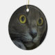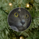 En närbild som skjutas av ansiktet av en grå färgkatt med gultögon och vidgade elever som vilar hans huvud på hans tass och fast beslutsamt stirrar på något bak kameran.