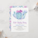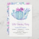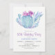 Succulents födelsedagsfest inbjudan. Inbjudan har violett lila och blå suckukaktus och blommönster.
