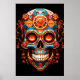 Sugar Skull design, in bright colors, including blue and orange, on a wall poster. Celebrate Day of the Dead, November 1-2.