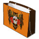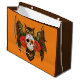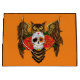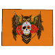 Ett brunt underbart hornsklubb uggla med en day of the dead-sockerskalle med röd ros i bakgrunden av orange